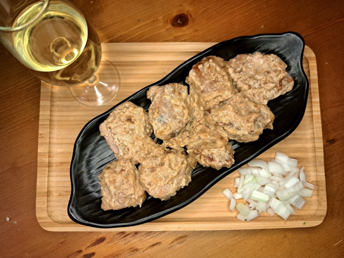 Ingredientes: Solomillo de cerdo 59%, LECHE, cebolla frita (cebolla, aceite de oliva virgen, sal, corrector de acidez E330 y espesantes E410 y E412), salsa verde [preparado LACTEO (proteínas de la LECHE, grasa vegetal de coco, LACTOSA), almidón modificado (maíz), sal, pimienta verde, aromas, potenciador del sabor E621 y colorante E150c], margarina (aceites vegetales de girasol, nabina y soja en proporciones variables, agua, grasa vegetal de palma, LECHE desnatada en polvo, sal, emulgentes E472 y E472c, aromas, conservador sorbato potásico, acidulante ácido cítrico, colorante carotenos y vitaminas A, D y E), caldo de vacuno concentrado(agua, huesos con carne de vacuno), extracto de levadura (contiene CEBADA, TRIGO, AVENA y CENTENO), sal, agua, colorante caramelo E150c, almidón de maíz, carne de vacuna deshidratada, potenciadores del sabor (contiene (inosinato APIO ) y guanilato disódicos) acidulante, ácido láctico y aromas. Puede contener HUEVO y MOSTAZA.